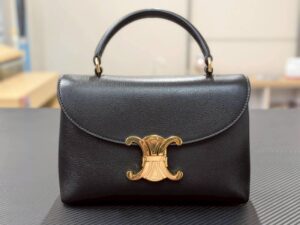 上質なブラックレザーに、セリーヌの象徴であるゴールドの「トリオンフ」クロージャーが輝く、非常にエレガントなバッグです。
